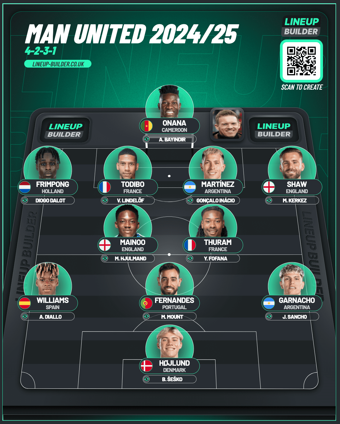 With Sancho returning to provide competition for Alejandro Garnacho on the left wing, a right winger is needed. Our selection is Nico Williams, with Amad Diallo as his understudy. All four can play both wings so cover is strong.