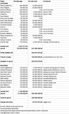 With the rest released on a free, ending their contracts, or for token amounts, this makes a total in transfer revenue of £221 million and a reduction in annual wage bill of £133 million. These two amounts were added to the reported £100m transfer kitty to reach a total figure of £454 million to spend on transfer fees and salaries of incoming stars.